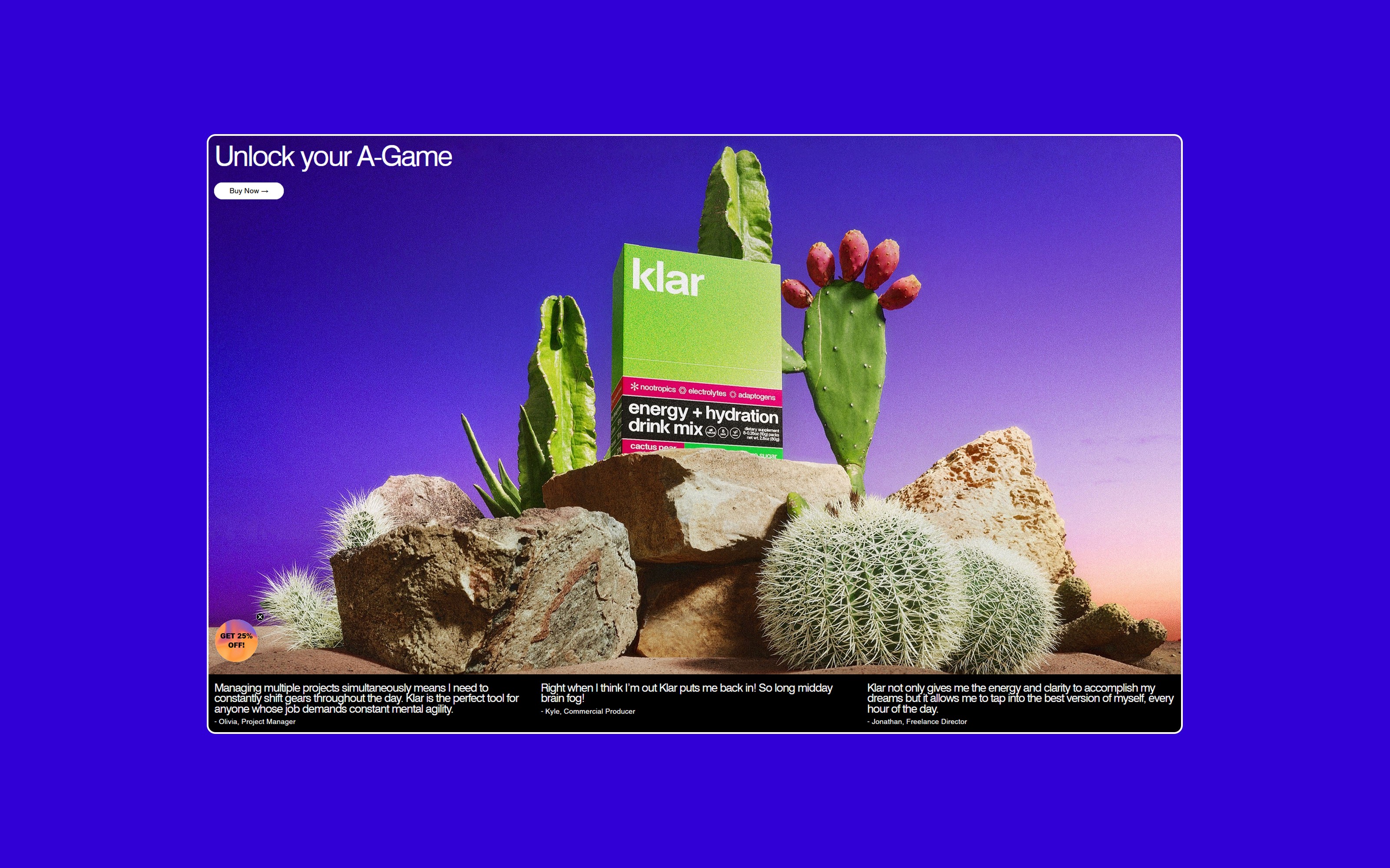 To support Klar Labs’ commitment to natural performance enhancement, we created a series of lifestyle and creative 3D visuals. Our role focused solely on producing high-quality renders that brought their product to life visually. The imagery showcases how the product fits into daily routines, emphasizing themes like energy, focus, and hydration — all based on Klar Labs’ existing branding and packaging design. Through photorealistic rendering, we aimed to visually communicate their dedication to quality and their mission to support peak performance, without contributing to the product or brand design itself.